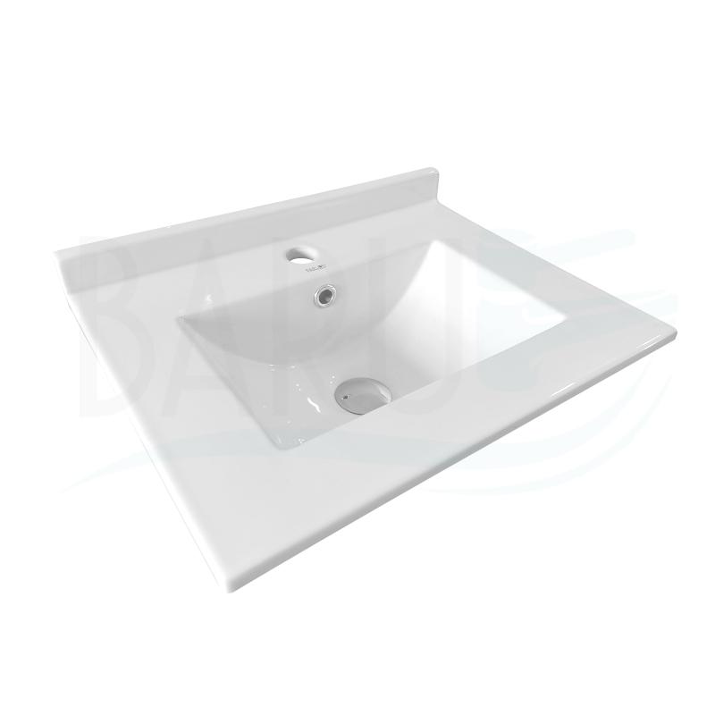 Lavamanos integrado de porcelana blanco para empotrar con rebose y salpicadero de 6Cm, medidas de 50x40 centímetros y 17Cm de altura