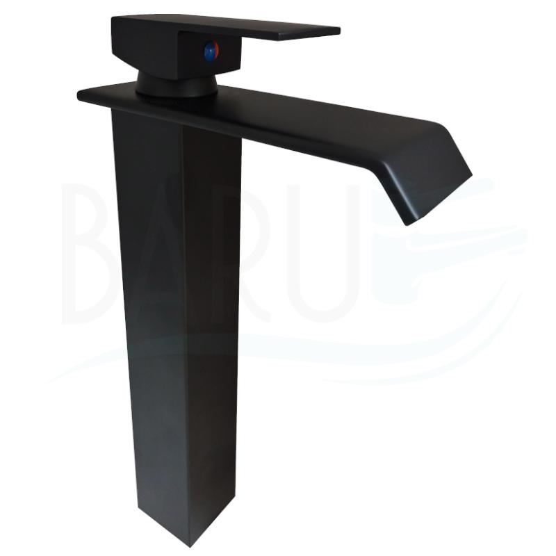 Mono control alto cuadrado cascada de lujo Negro mate con cuello plano y recto con ángulo de 45° para lavamanos de sobre poner