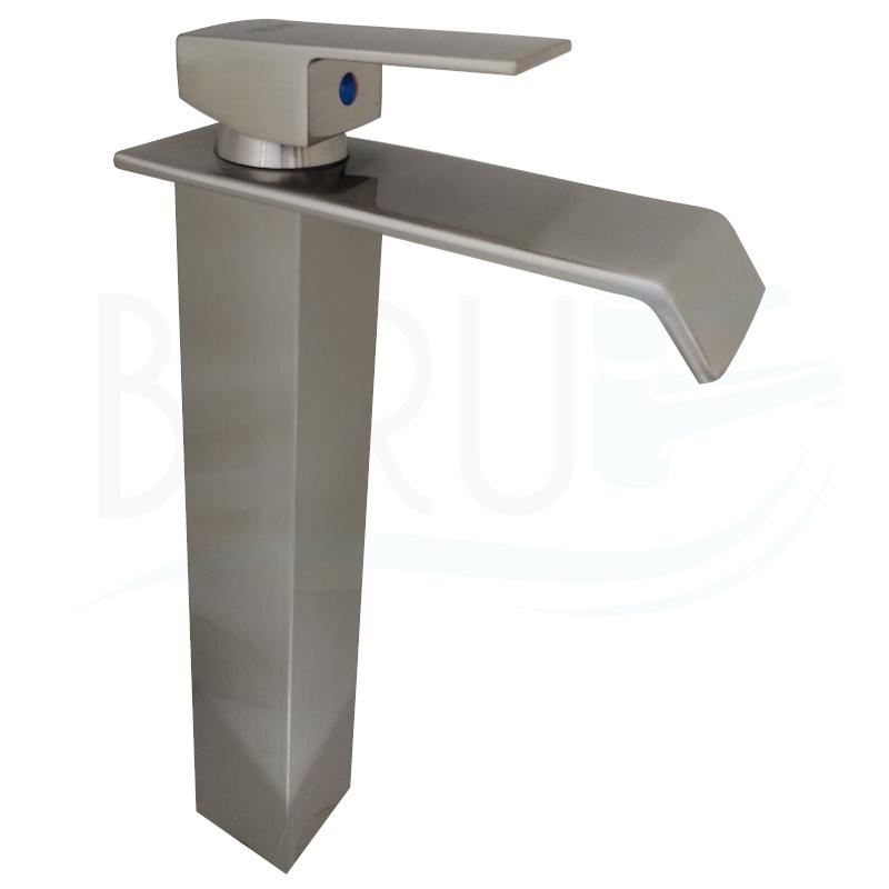 Mono control alto cuadrado cascada de lujo Satinada con cuello plano y recto con ángulo de 45° para lavamanos de sobre poner