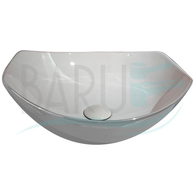 Lavamanos de sobre poner de porcelana estilo estadio color blanco con acabado exterior metalizado cromo y medidas en centímetros así 42x38x14