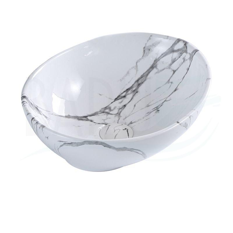 Lavamanos en porcelana carrara estilo estadio, acabado marmolizado con vetas negras y medidas en centímetros así 40x33x15