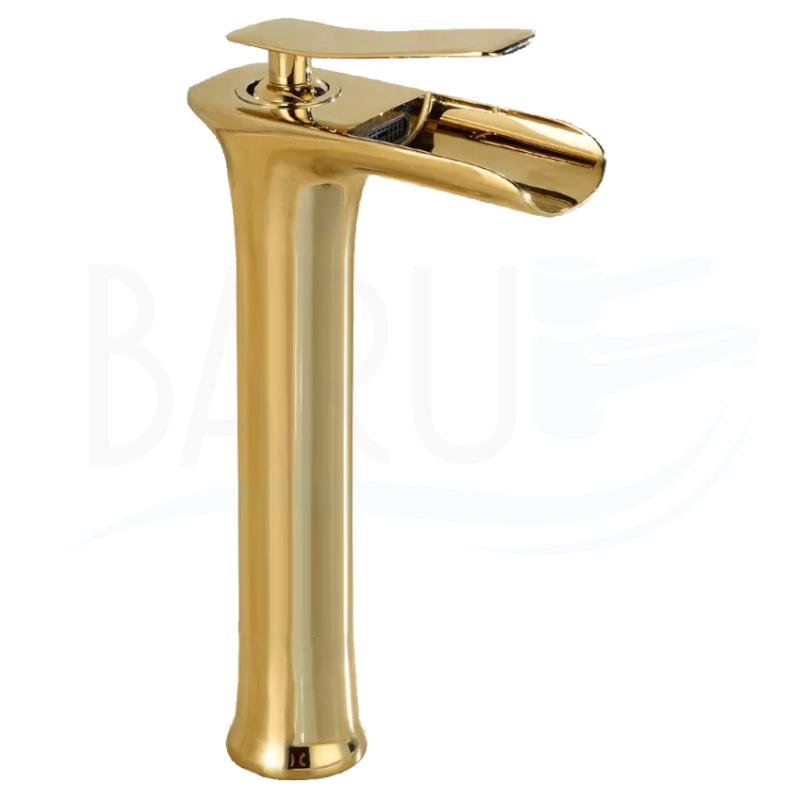 Mono control alto de lujo con estilo cascada en canoa dorado para lavamanos de sobre poner con 29Cm de altura